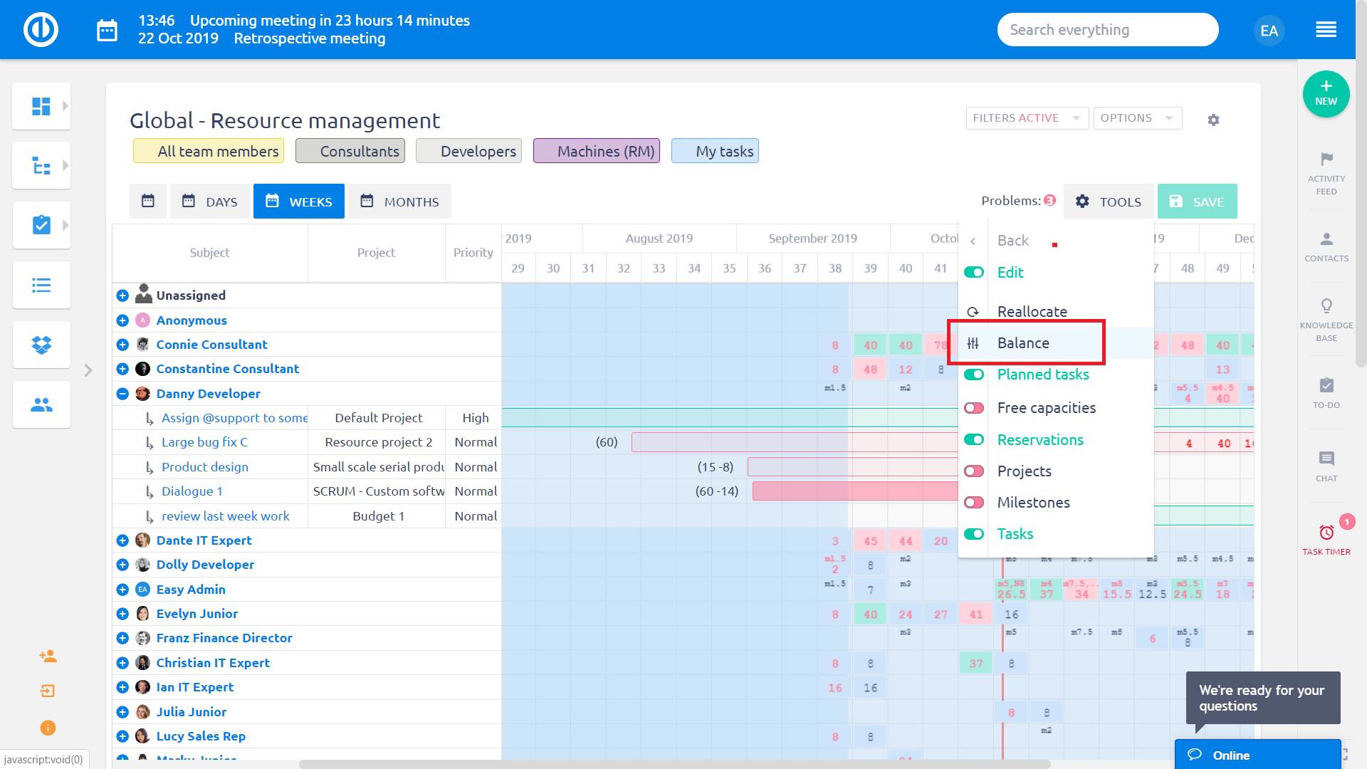 - Automatikus Erőforrás Allokátor – az Erőforrás-menedzsment segítségével a felhasználók számára kijelölt összes látható feladat, összes kiosztott óráját a rendelkezésre álló kapacitásuk alapján oszthatja el könnyen