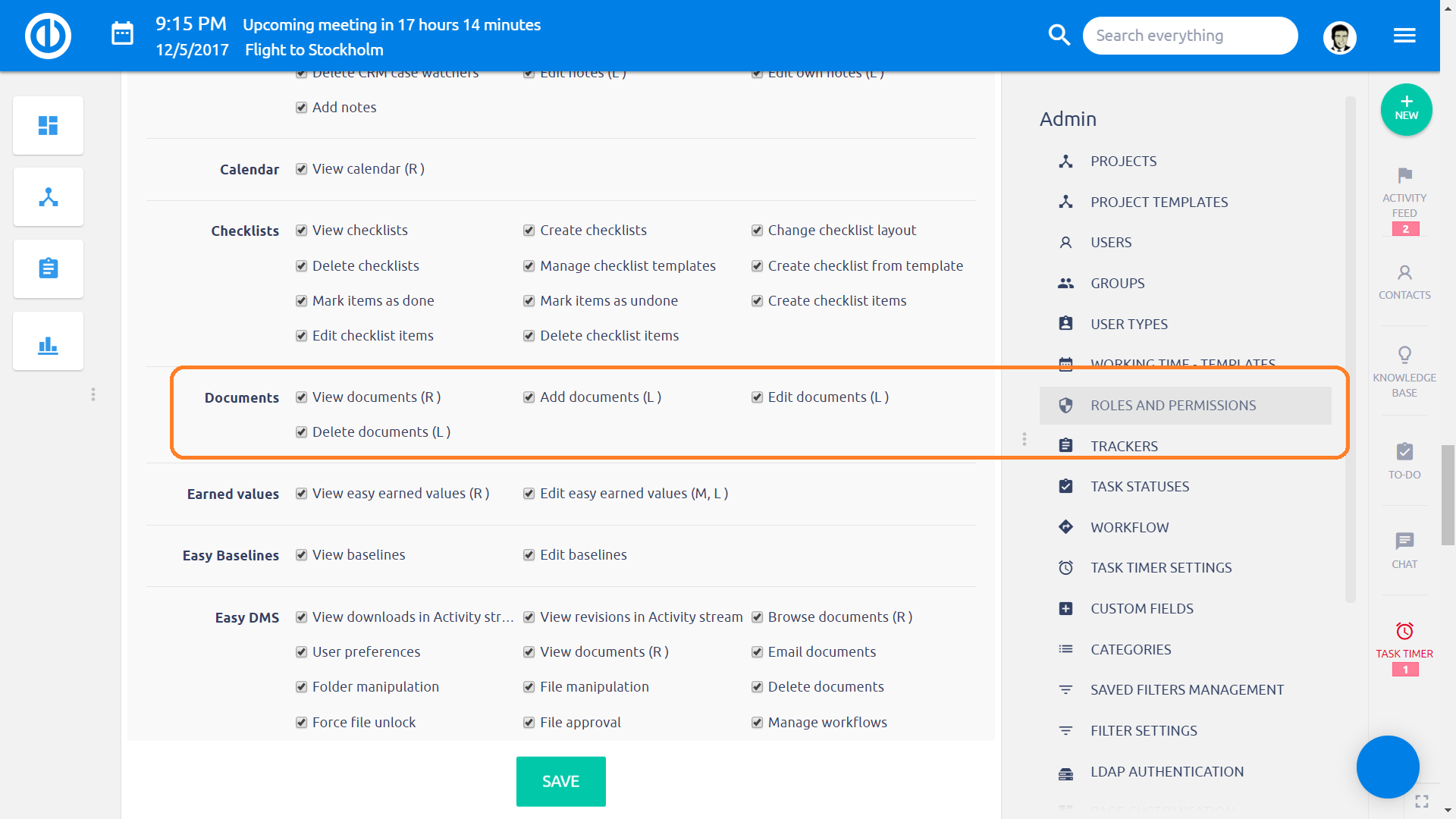Két modult használhat arra, hogy a projekthez dokumentumokat csatoljon. Az első a Dokumentumok modul, amely az alapcsomag (Essentials) része. A második komplexebb megoldás az Easy DMS - kiegészítő modul, amelyet a Client zone felületen tud megvásárolni. Most részletesen a Dokumentumokat tekintjük át, a DMS modul használatáról egy másik bejegyzésben olvashat részletesen. A dokumentumok kezeléséhez szükséges, hogy a szerepköre rendelkezzen a képen látható jogosultságokkal. Ezt a Több menü » Adminisztráció » Szerepkörök és engedélyek menüben állíthatja be.