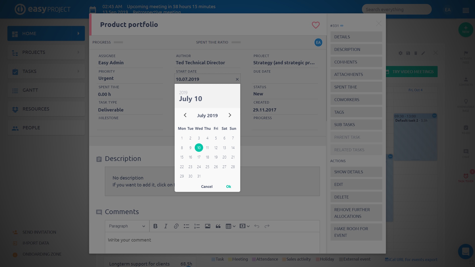 A feladatok adatait is könnyen módosíthatja. Kattintson a feladat nevére és a felugró ablakban végezze el a módosításokat. Ezen a felületen eltöltött időt is rögzíthet, hozzászólást írhat a feladathoz stb.