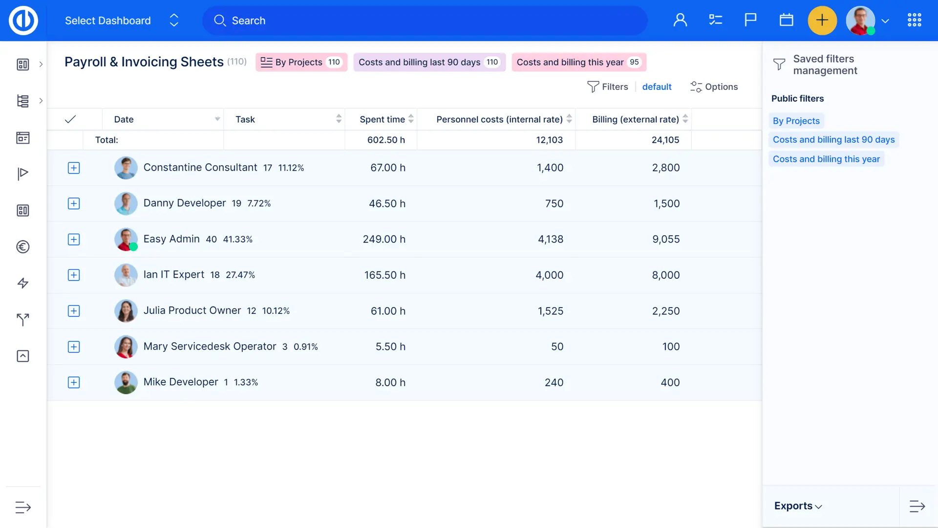 - jelenléti ívek időráfordítás adatai szorozva belső / külső óradíjakkal