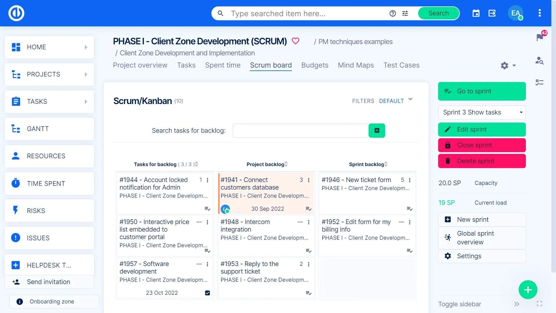 Az összes futó művelet elérhető a SCRUM master számára. Jelenlegi sprint státuszok, sprint teljesítés áttekintés, napi, heti vagy havi sebesség, lezárt történet állomások, vizuális diagramok és további testreszabható modulok és beállítások