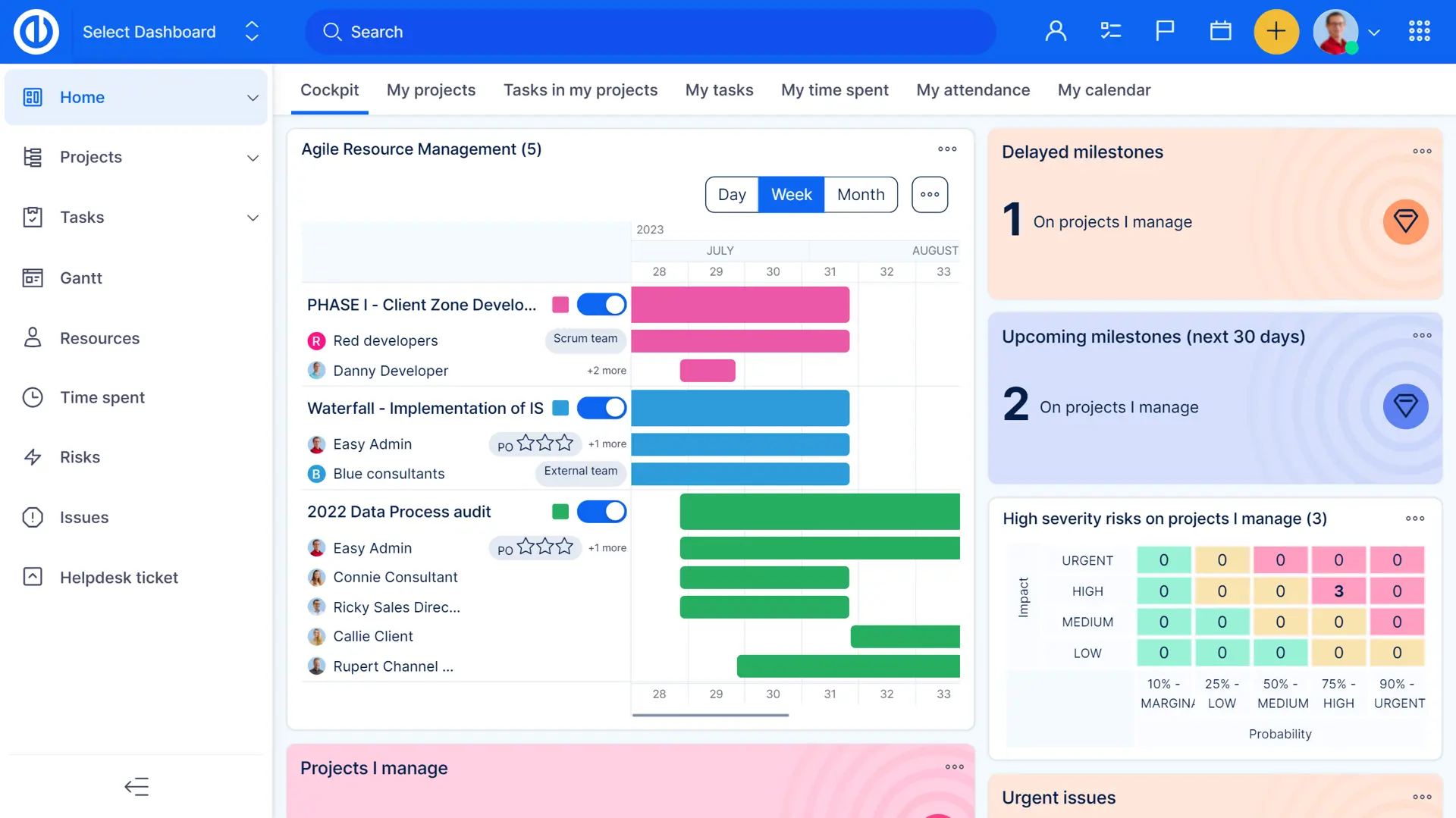 Használjon egy előre definiált Easy Irányítópultot, mely akár a legelfoglaltabb projektmenedzser igényeit is kielégíti. Kapjon egy azonnali áttekintést a nyitott és folyamatban lévő problémákról karöltve a projekt státuszok vizuális megjelenítésével. A Tevékenységfolyam megmutatja a legutolsó frissítéseket, emellett az olyan eszközök, mint az értekezlet naptár, erőforrás-menedzsment és egyebek csupán egy kattintásra vannak.