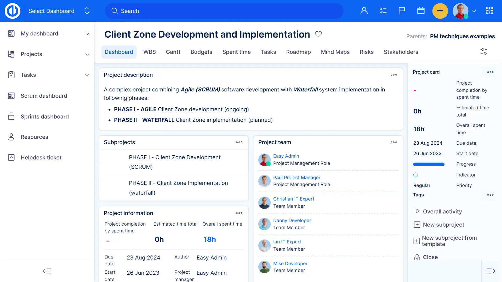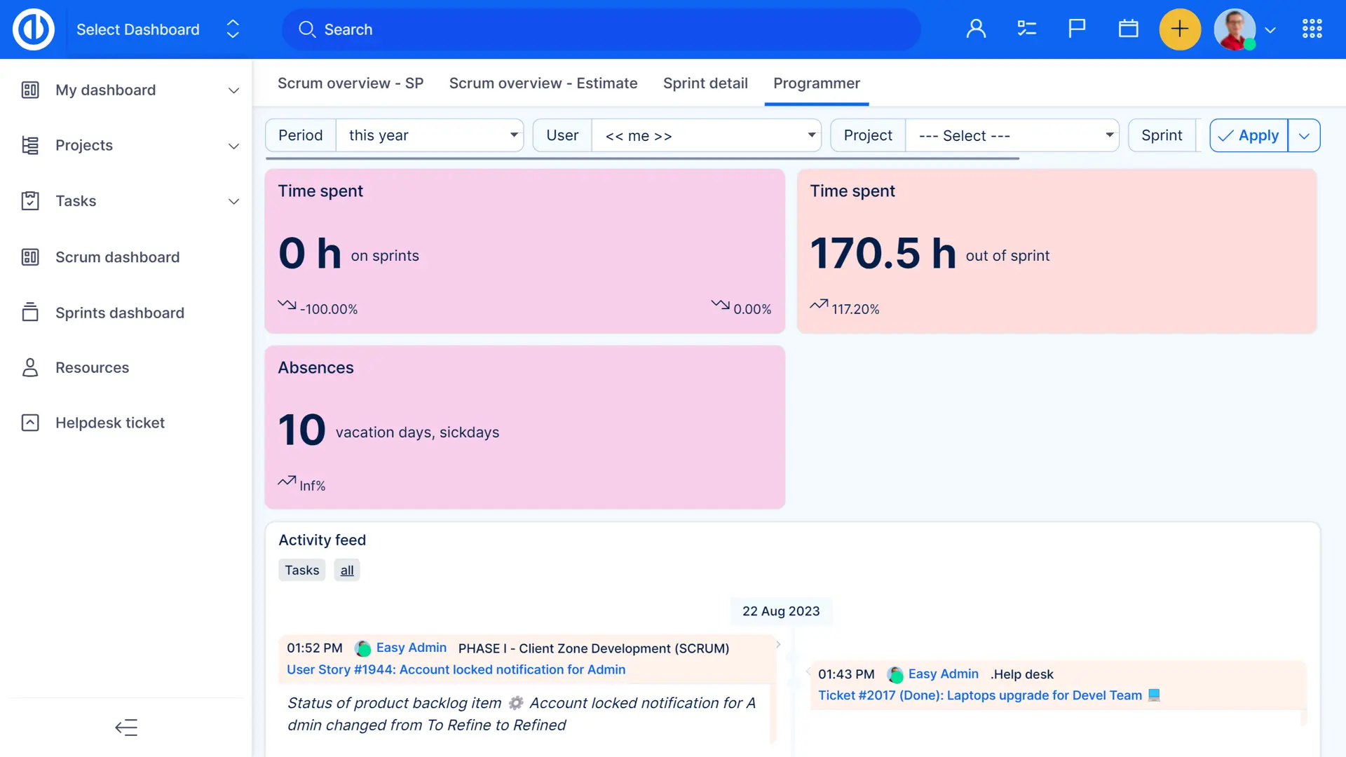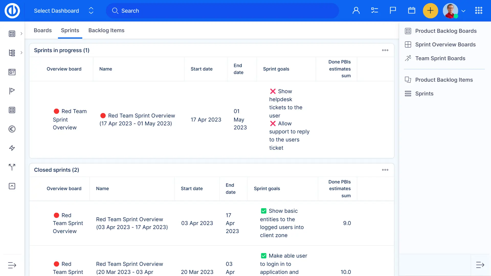 Az összes futó művelet elérhető a SCRUM master számára. Jelenlegi sprint státuszok, sprint teljesítés áttekintés, napi, heti vagy havi sebesség, lezárt történet állomások, vizuális diagramok és további testreszabható modulok és beállítások