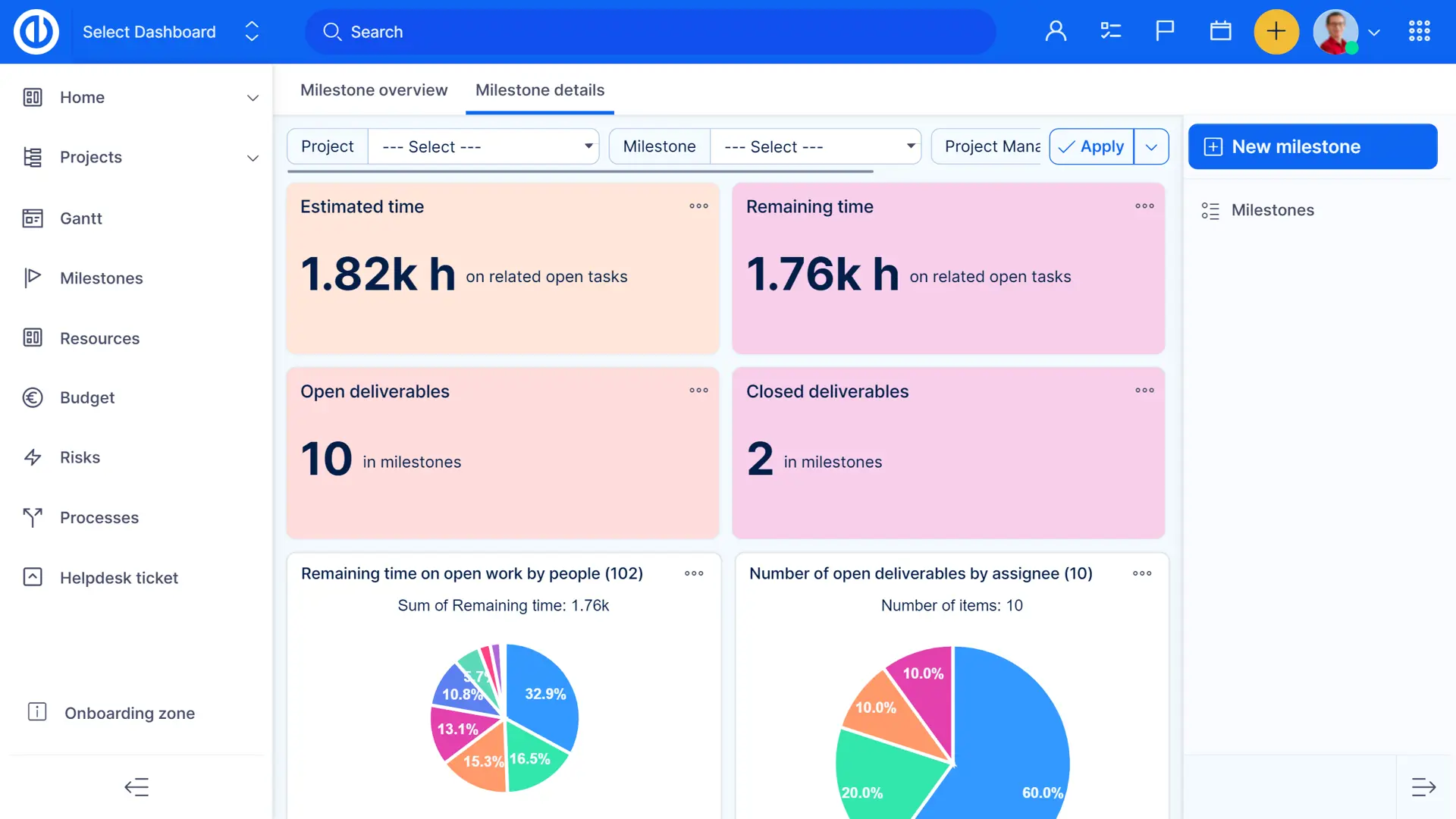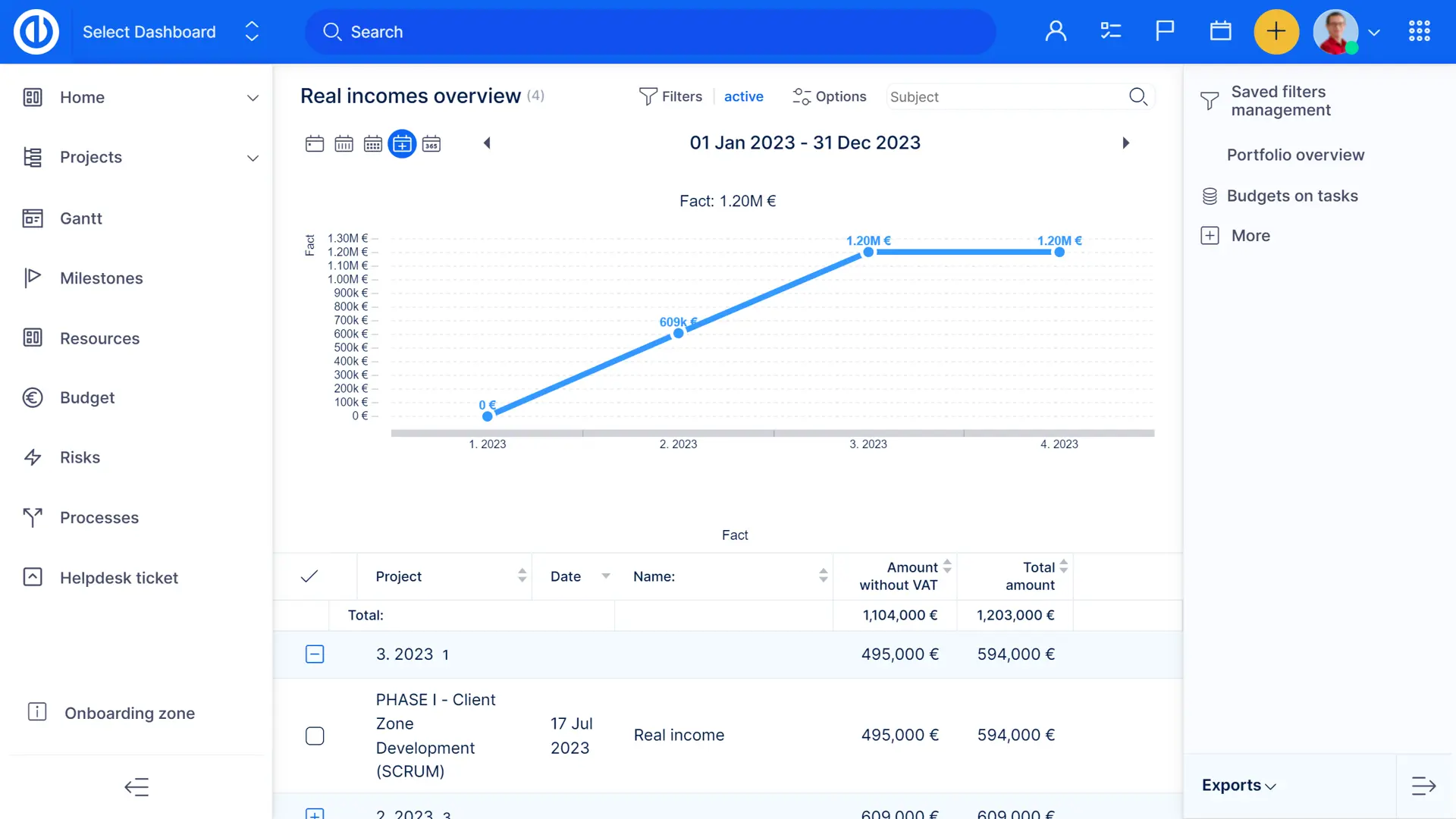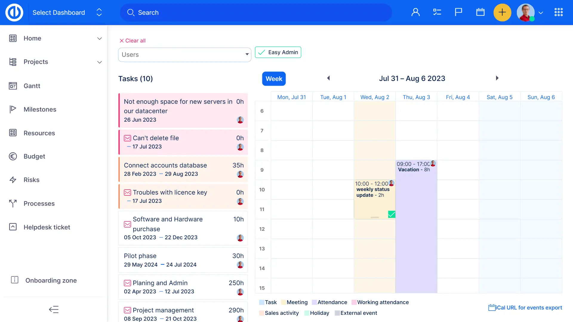 Ügyvezetőként fontos, hogy egy pillanat alatt gyors és átfogó képet kapjunk a vállalat teljesítményéről, anélkül, hogy végtelennek tűnő adatlistákat kelljen végignézni. Az Easy Project lehetővé teszi, hogy bármilyen adatot diagrammá varázsoljon és összehasonlítsa a tervezett és aktuális teljesítményt, illetve gyorsan elérjen olyan kiegészítő modulokat, mint az Értekezlet szervező vagy a HR irányítópult.